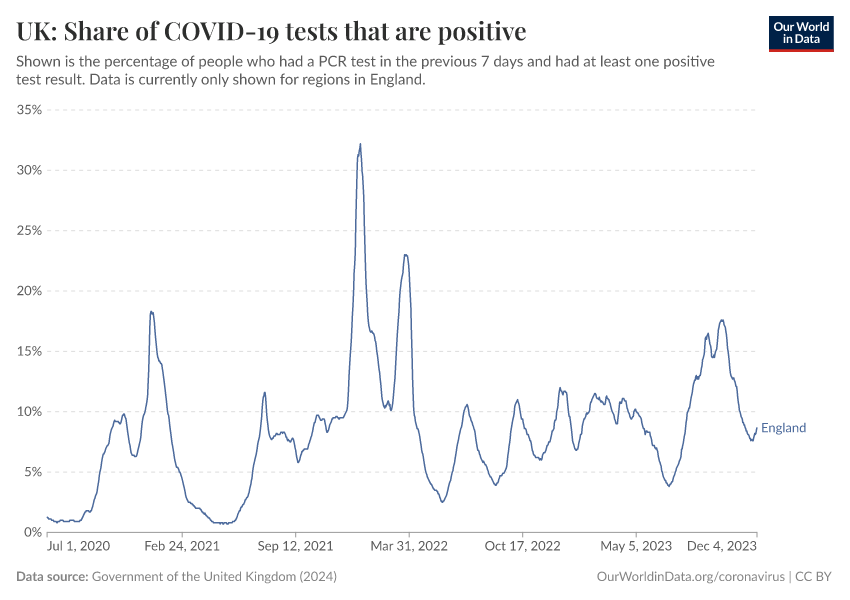 Government of the United Kingdom (2024) – with minor processing by Our World in Data. “UK: Share of COVID-19 tests that are positive” [dataset]. Government of the United Kingdom, “UKHSA data dashboard” [original data]. Retrieved December 26, 2025 from https://archive.ourworldindata.org/20250909-093708/grapher/uk-covid-positivity.html (archived on September 9, 2025).