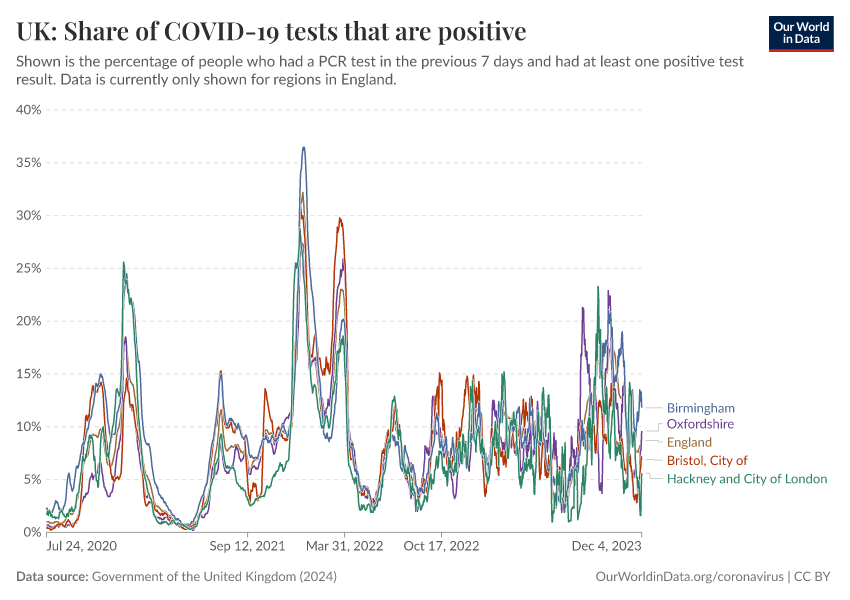 Government of the United Kingdom (2024) – with minor processing by Our World in Data. “UK: Share of COVID-19 tests that are positive” [dataset]. Government of the United Kingdom, “UKHSA data dashboard” [original data]. Retrieved December 8, 2025 from https://archive.ourworldindata.org/20250909-093708/grapher/uk-covid-positivity.html (archived on September 9, 2025).