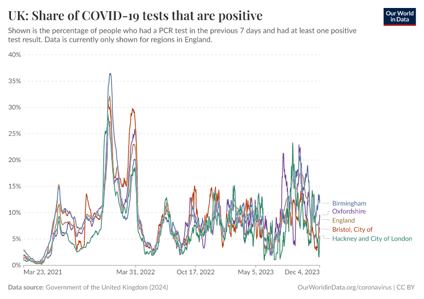 Government of the United Kingdom (2024) – with minor processing by Our World in Data. “UK: Share of COVID-19 tests that are positive” [dataset]. Government of the United Kingdom, “UKHSA data dashboard” [original data]. Retrieved December 10, 2025 from https://archive.ourworldindata.org/20250909-093708/grapher/uk-covid-positivity.html (archived on September 9, 2025).
