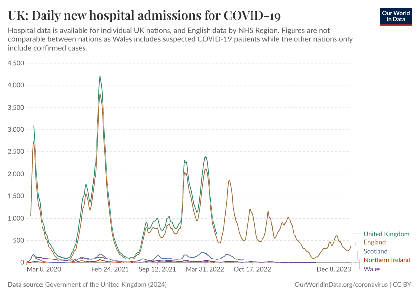 Government of the United Kingdom (2024) – with minor processing by Our World in Data. “UK: Daily new hospital admissions for COVID-19” [dataset]. Government of the United Kingdom, “UKHSA data dashboard” [original data]. Retrieved January 19, 2026 from https://archive.ourworldindata.org/20250909-093708/grapher/uk-daily-covid-admissions.html (archived on September 9, 2025).