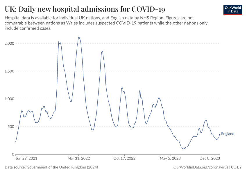 Government of the United Kingdom (2024) – with minor processing by Our World in Data. “UK: Daily new hospital admissions for COVID-19” [dataset]. Government of the United Kingdom, “UKHSA data dashboard” [original data]. Retrieved January 14, 2026 from https://archive.ourworldindata.org/20250909-093708/grapher/uk-daily-covid-admissions.html (archived on September 9, 2025).