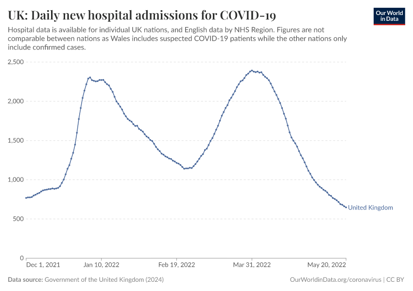 Government of the United Kingdom (2024) – with minor processing by Our World in Data. “UK: Daily new hospital admissions for COVID-19” [dataset]. Government of the United Kingdom, “UKHSA data dashboard” [original data]. Retrieved December 30, 2025 from https://archive.ourworldindata.org/20250909-093708/grapher/uk-daily-covid-admissions.html (archived on September 9, 2025).