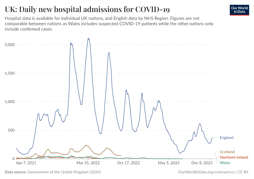 Government of the United Kingdom (2024) – with minor processing by Our World in Data. “UK: Daily new hospital admissions for COVID-19” [dataset]. Government of the United Kingdom, “UKHSA data dashboard” [original data]. Retrieved December 27, 2025 from https://archive.ourworldindata.org/20250909-093708/grapher/uk-daily-covid-admissions.html (archived on September 9, 2025).