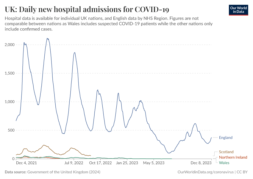 Government of the United Kingdom (2024) – with minor processing by Our World in Data. “UK: Daily new hospital admissions for COVID-19” [dataset]. Government of the United Kingdom, “UKHSA data dashboard” [original data]. Retrieved December 28, 2025 from https://archive.ourworldindata.org/20250909-093708/grapher/uk-daily-covid-admissions.html (archived on September 9, 2025).