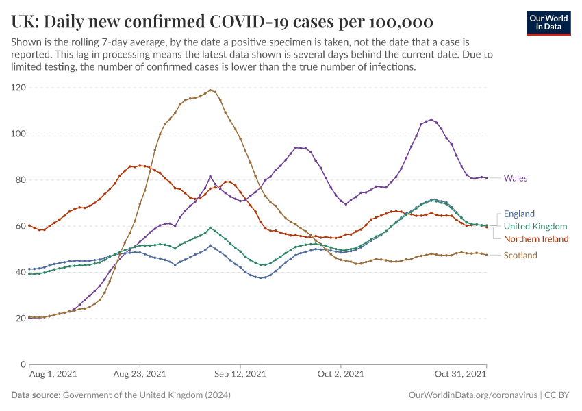 Government of the United Kingdom (2024) – with minor processing by Our World in Data. “UK: Daily new confirmed COVID-19 cases per 100,000” [dataset]. Government of the United Kingdom, “UKHSA data dashboard” [original data]. Retrieved December 21, 2025 from https://archive.ourworldindata.org/20250909-093708/grapher/uk-daily-covid-cases-7day-average.html (archived on September 9, 2025).