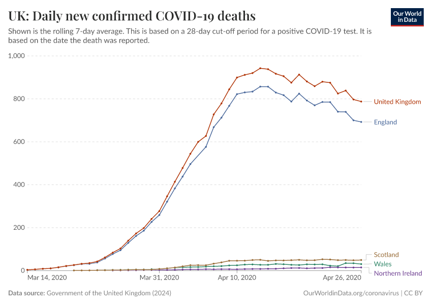 Government of the United Kingdom (2024) – with minor processing by Our World in Data. “UK: Daily new confirmed COVID-19 deaths” [dataset]. Government of the United Kingdom, “UKHSA data dashboard” [original data]. Retrieved December 7, 2025 from https://archive.ourworldindata.org/20250909-093708/grapher/uk-daily-covid-deaths.html (archived on September 9, 2025).