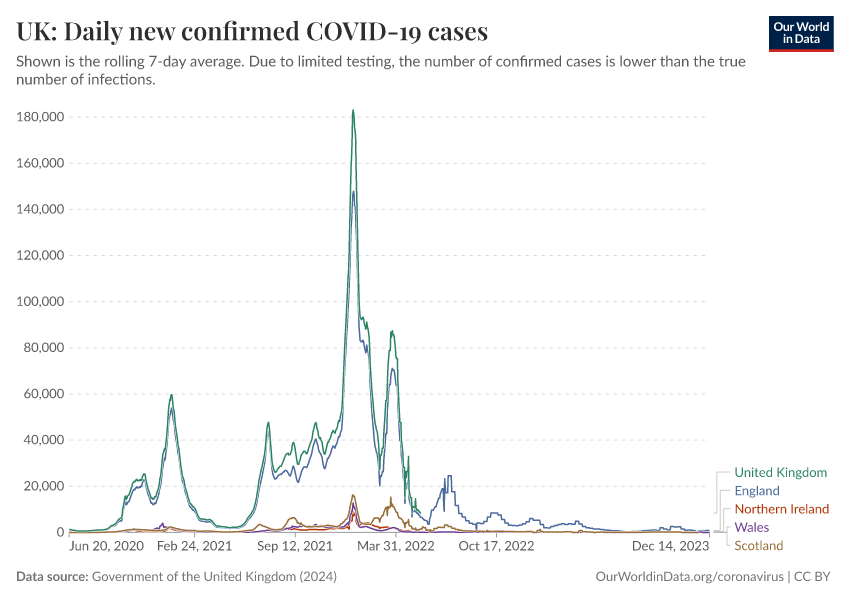 Government of the United Kingdom (2024) – with minor processing by Our World in Data. “UK: Daily new confirmed COVID-19 cases” [dataset]. Government of the United Kingdom, “UKHSA data dashboard” [original data]. Retrieved February 16, 2026 from https://archive.ourworldindata.org/20250909-093708/grapher/uk-daily-new-covid-cases.html (archived on September 9, 2025).