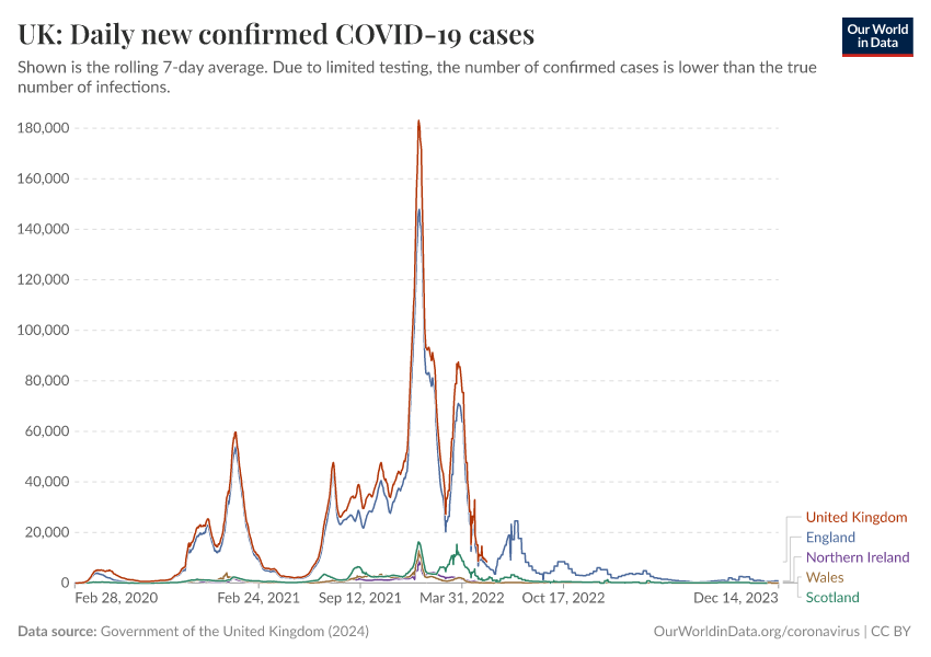 Government of the United Kingdom (2024) – with minor processing by Our World in Data. “UK: Daily new confirmed COVID-19 cases” [dataset]. Government of the United Kingdom, “UKHSA data dashboard” [original data]. Retrieved December 17, 2025 from https://archive.ourworldindata.org/20250909-093708/grapher/uk-daily-new-covid-cases.html (archived on September 9, 2025).