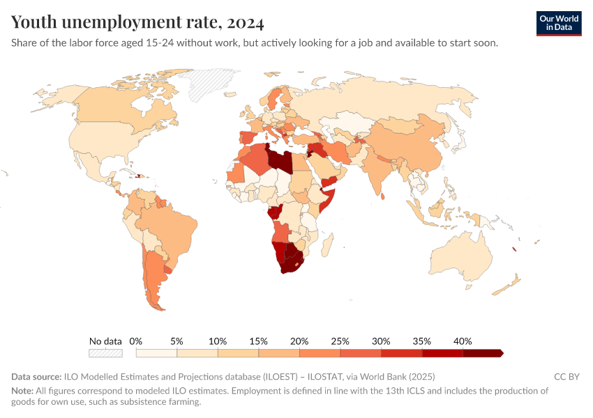“Data Page: Youth unemployment rate”. Our World in Data (2025). Data adapted from ILO Modelled Estimates and Projections database (ILOEST) – ILOSTAT, via World Bank. Retrieved from https://archive.ourworldindata.org/20251110-103249/grapher/unemployment-rate-for-young-people.html [online resource] (archived on November 10, 2025).How to cite this data