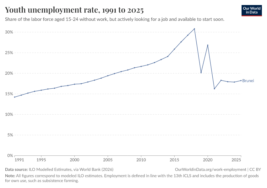 ILO Modelled Estimates, via World Bank (2026) – processed by Our World in Data. “Youth unemployment rate – ILO” [dataset]. ILO Modelled Estimates, via World Bank, “World Development Indicators 125” [original data]. Retrieved April 16, 2026 from https://archive.ourworldindata.org/20260304-094028/grapher/unemployment-rate-for-young-people.html (archived on March 4, 2026).