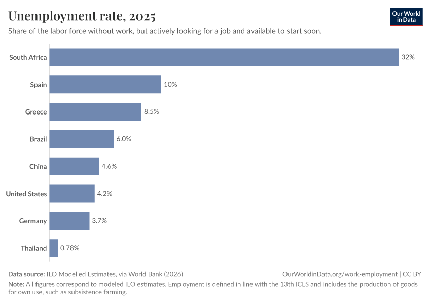 ILO Modelled Estimates, via World Bank (2026) – processed by Our World in Data. “Unemployment rate – ILO” [dataset]. ILO Modelled Estimates, via World Bank, “World Development Indicators 125” [original data]. Retrieved April 4, 2026 from https://archive.ourworldindata.org/20260309-120101/grapher/unemployment-rate.html (archived on March 9, 2026).