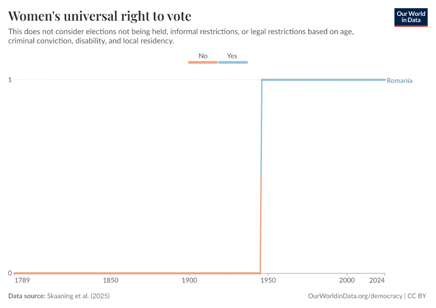 “Data Page: Women's universal right to vote”, part of the following publication: Bastian Herre, Lucas Rodés-Guirao, and Esteban Ortiz-Ospina (2013) - “Democracy”. Data adapted from Skaaning et al.. Retrieved from https://archive.ourworldindata.org/20250909-093708/grapher/universal-suffrage-women-lexical.html [online resource] (archived on September 9, 2025).How to cite this data