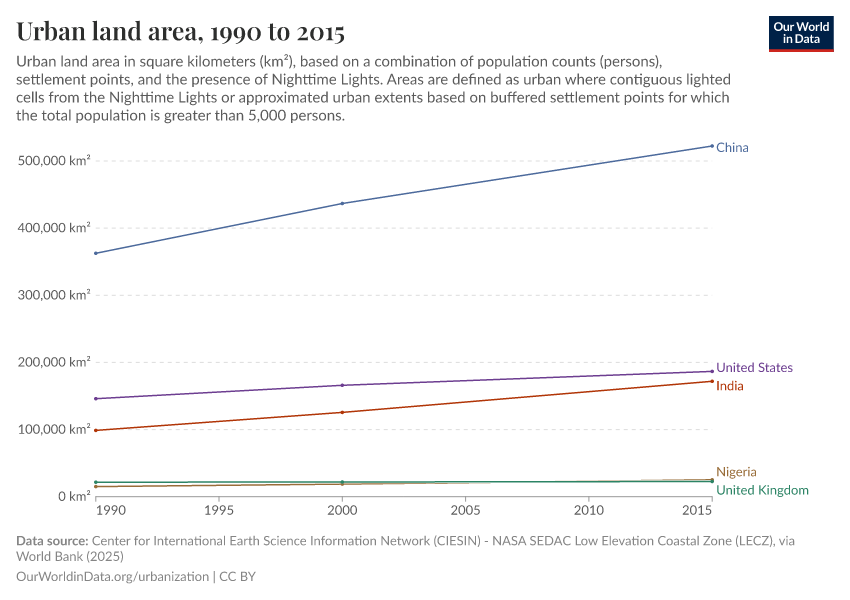 “Data Page: Urban land area”. Our World in Data (2025). Data adapted from Center for International Earth Science Information Network (CIESIN) - NASA SEDAC Low Elevation Coastal Zone (LECZ), via World Bank. Retrieved from https://archive.ourworldindata.org/20251220-152415/grapher/urban-land-area.html [online resource] (archived on December 20, 2025).How to cite this data