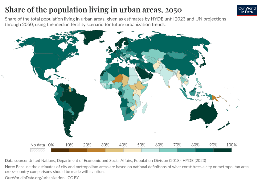“Data Page: Share of population residing in urban areas”, part of the following publication: Hannah Ritchie, Veronika Samborska, and Max Roser (2024) - “Urbanization”. Data adapted from United Nations, Department of Economic and Social Affairs, Population Division, PBL Netherlands Environmental Assessment Agency. Retrieved from https://archive.ourworldindata.org/20250909-093708/grapher/urban-population-share-2050.html [online resource] (archived on September 9, 2025).How to cite this data