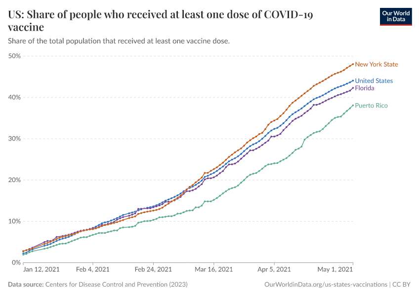 Centers for Disease Control and Prevention (2023) – processed by Our World in Data. “US: Share of people who received at least one dose of COVID-19 vaccine” [dataset]. Centers for Disease Control and Prevention, “COVID-19, Vaccinations (United States)” [original data]. Retrieved December 19, 2025 from https://archive.ourworldindata.org/20250909-093708/grapher/us-covid-19-share-people-vaccinated.html (archived on September 9, 2025).