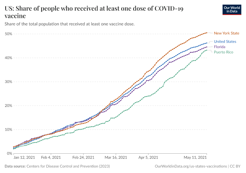 Centers for Disease Control and Prevention (2023) – processed by Our World in Data. “US: Share of people who received at least one dose of COVID-19 vaccine” [dataset]. Centers for Disease Control and Prevention, “COVID-19, Vaccinations (United States)” [original data]. Retrieved December 19, 2025 from https://archive.ourworldindata.org/20250909-093708/grapher/us-covid-19-share-people-vaccinated.html (archived on September 9, 2025).