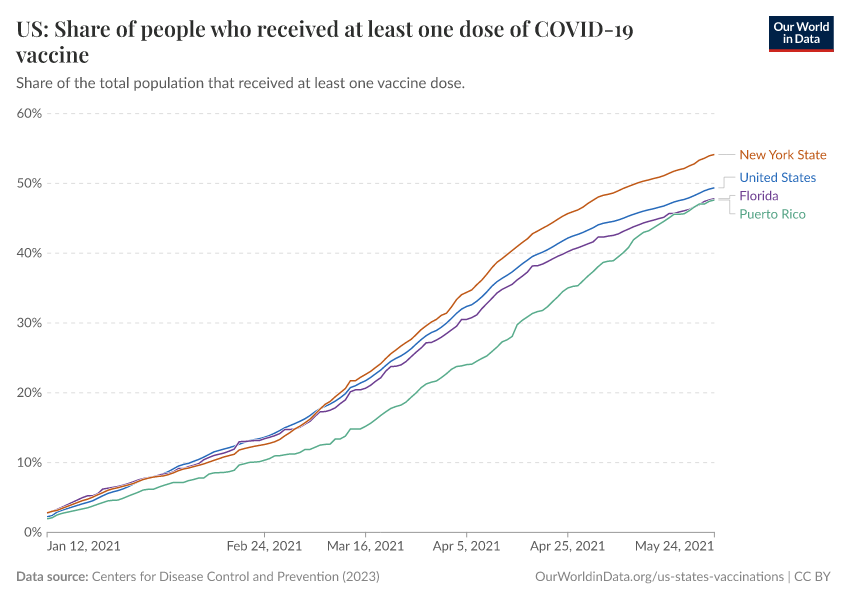 Centers for Disease Control and Prevention (2023) – processed by Our World in Data. “US: Share of people who received at least one dose of COVID-19 vaccine” [dataset]. Centers for Disease Control and Prevention, “COVID-19, Vaccinations (United States)” [original data]. Retrieved December 19, 2025 from https://archive.ourworldindata.org/20250909-093708/grapher/us-covid-19-share-people-vaccinated.html (archived on September 9, 2025).