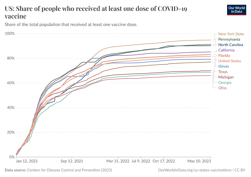 Centers for Disease Control and Prevention (2023) – processed by Our World in Data. “US: Share of people who received at least one dose of COVID-19 vaccine” [dataset]. Centers for Disease Control and Prevention, “COVID-19, Vaccinations (United States)” [original data]. Retrieved November 16, 2025 from https://archive.ourworldindata.org/20250909-093708/grapher/us-covid-19-share-people-vaccinated.html (archived on September 9, 2025).