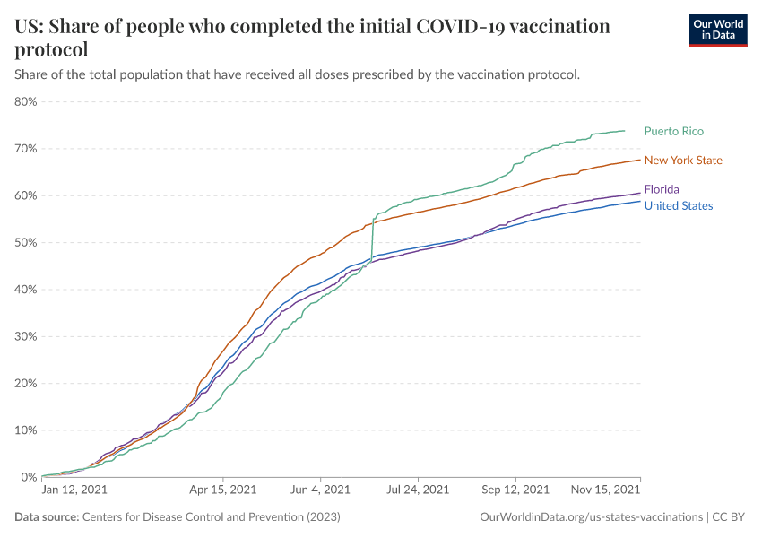 Centers for Disease Control and Prevention (2023) – processed by Our World in Data. “US: Share of people who completed the initial COVID-19 vaccination protocol” [dataset]. Centers for Disease Control and Prevention, “COVID-19, Vaccinations (United States)” [original data]. Retrieved April 3, 2026 from https://archive.ourworldindata.org/20260304-094028/grapher/us-covid-share-fully-vaccinated.html (archived on March 4, 2026).