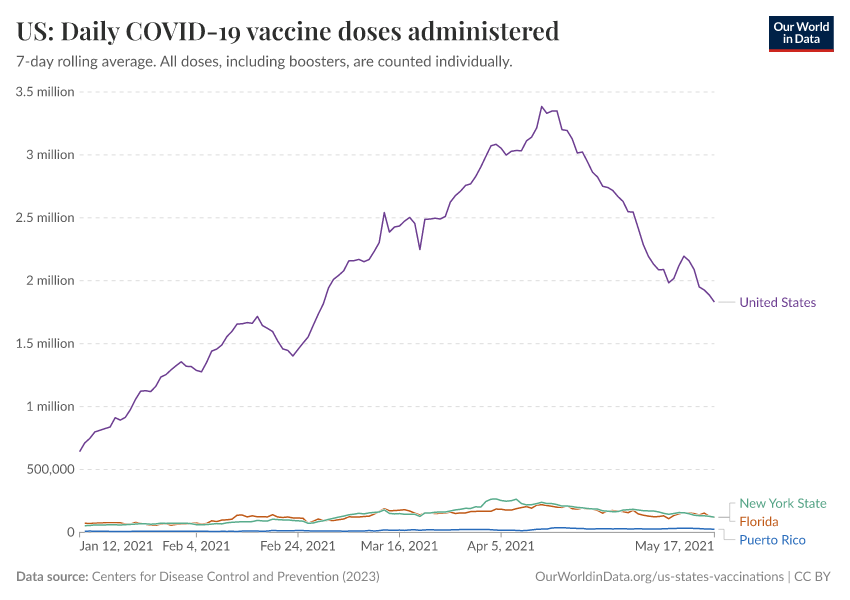 Centers for Disease Control and Prevention (2023) – processed by Our World in Data. “US: Daily COVID-19 vaccine doses administered” [dataset]. Centers for Disease Control and Prevention, “COVID-19, Vaccinations (United States)” [original data]. Retrieved December 19, 2025 from https://archive.ourworldindata.org/20250909-093708/grapher/us-daily-covid-vaccine-doses-administered.html (archived on September 9, 2025).