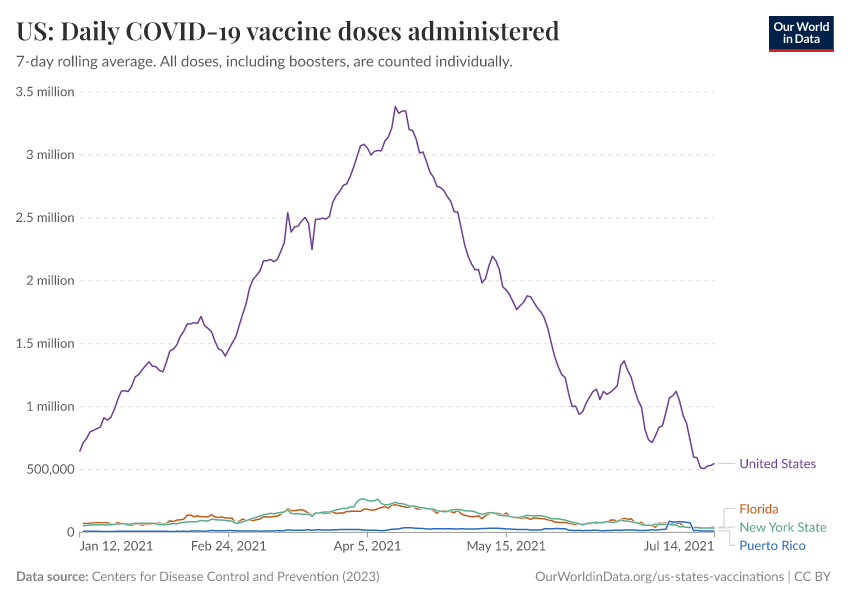 Centers for Disease Control and Prevention (2023) – processed by Our World in Data. “US: Daily COVID-19 vaccine doses administered” [dataset]. Centers for Disease Control and Prevention, “COVID-19, Vaccinations (United States)” [original data]. Retrieved December 20, 2025 from https://archive.ourworldindata.org/20250909-093708/grapher/us-daily-covid-vaccine-doses-administered.html (archived on September 9, 2025).