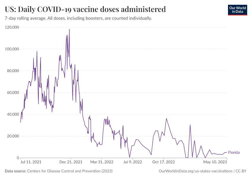 Centers for Disease Control and Prevention (2023) – processed by Our World in Data. “US: Daily COVID-19 vaccine doses administered” [dataset]. Centers for Disease Control and Prevention, “COVID-19, Vaccinations (United States)” [original data]. Retrieved February 17, 2026 from https://archive.ourworldindata.org/20250909-093708/grapher/us-daily-covid-vaccine-doses-administered.html (archived on September 9, 2025).