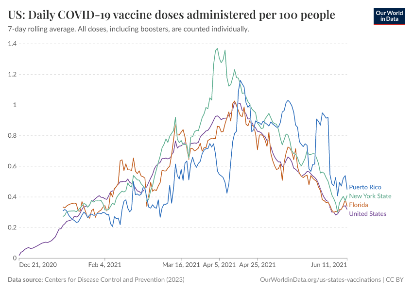 Centers for Disease Control and Prevention (2023) – processed by Our World in Data. “US: Daily COVID-19 vaccine doses administered per 100 people” [dataset]. Centers for Disease Control and Prevention, “COVID-19, Vaccinations (United States)” [original data]. Retrieved December 19, 2025 from https://archive.ourworldindata.org/20250909-093708/grapher/us-daily-covid-vaccine-doses-per-100.html (archived on September 9, 2025).