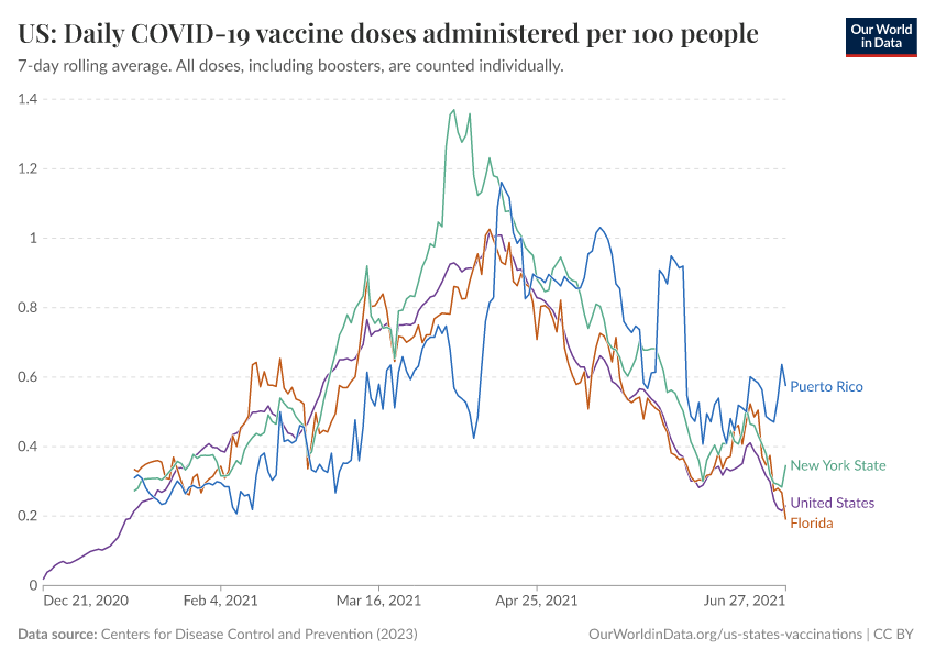 Centers for Disease Control and Prevention (2023) – processed by Our World in Data. “US: Daily COVID-19 vaccine doses administered per 100 people” [dataset]. Centers for Disease Control and Prevention, “COVID-19, Vaccinations (United States)” [original data]. Retrieved December 19, 2025 from https://archive.ourworldindata.org/20250909-093708/grapher/us-daily-covid-vaccine-doses-per-100.html (archived on September 9, 2025).