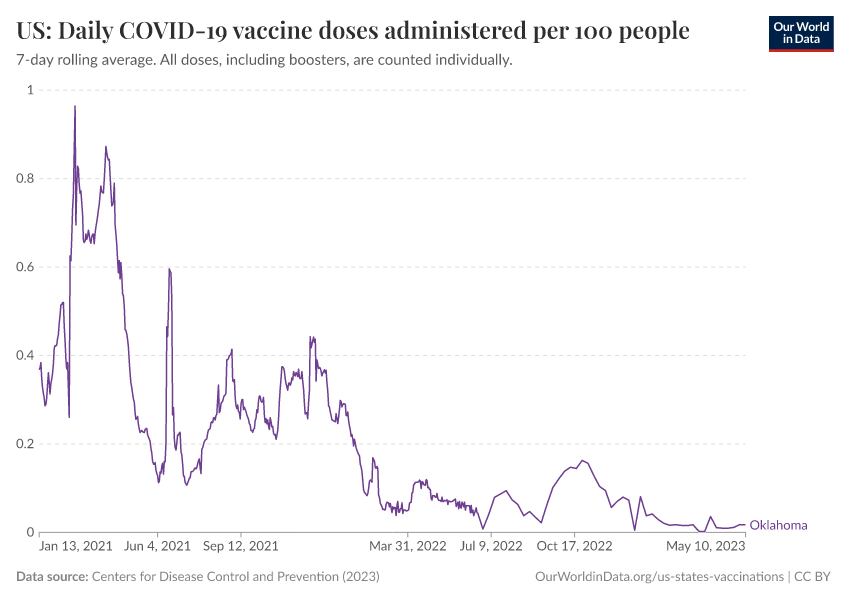 Centers for Disease Control and Prevention (2023) – processed by Our World in Data. “US: Daily COVID-19 vaccine doses administered per 100 people” [dataset]. Centers for Disease Control and Prevention, “COVID-19, Vaccinations (United States)” [original data]. Retrieved December 10, 2025 from https://archive.ourworldindata.org/20250909-093708/grapher/us-daily-covid-vaccine-doses-per-100.html (archived on September 9, 2025).