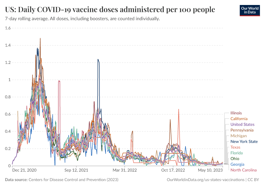 Centers for Disease Control and Prevention (2023) – processed by Our World in Data. “US: Daily COVID-19 vaccine doses administered per 100 people” [dataset]. Centers for Disease Control and Prevention, “COVID-19, Vaccinations (United States)” [original data]. Retrieved November 10, 2025 from https://archive.ourworldindata.org/20250909-093708/grapher/us-daily-covid-vaccine-doses-per-100.html (archived on September 9, 2025).