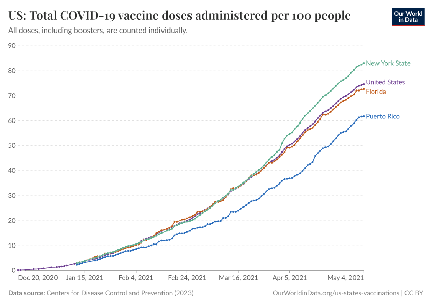 Centers for Disease Control and Prevention (2023) – processed by Our World in Data. “US: Total COVID-19 vaccine doses administered per 100 people” [dataset]. Centers for Disease Control and Prevention, “COVID-19, Vaccinations (United States)” [original data]. Retrieved December 19, 2025 from https://archive.ourworldindata.org/20250909-093708/grapher/us-state-covid-vaccines-per-100.html (archived on September 9, 2025).