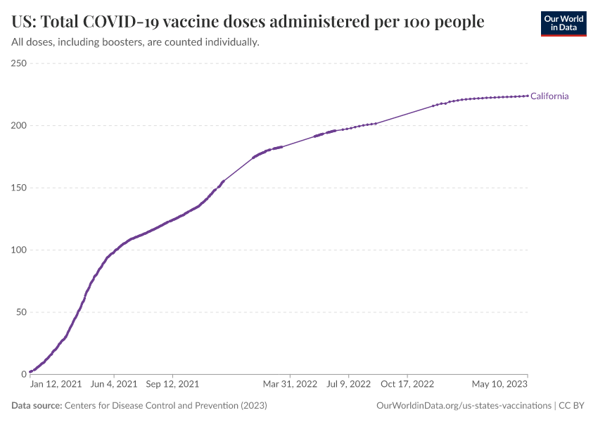 Centers for Disease Control and Prevention (2023) – processed by Our World in Data. “US: Total COVID-19 vaccine doses administered per 100 people” [dataset]. Centers for Disease Control and Prevention, “COVID-19, Vaccinations (United States)” [original data]. Retrieved January 16, 2026 from https://archive.ourworldindata.org/20250909-093708/grapher/us-state-covid-vaccines-per-100.html (archived on September 9, 2025).