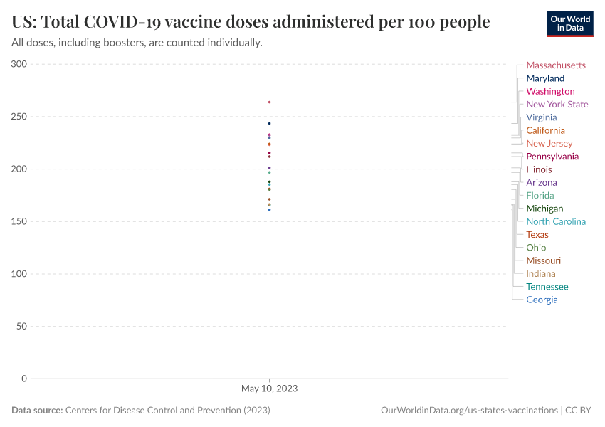 “Data Page: US: Total COVID-19 vaccine doses administered per 100 people”, part of the following publication: Edouard Mathieu, Hannah Ritchie, Lucas Rodés-Guirao, Cameron Appel, Daniel Gavrilov, Charlie Giattino, Joe Hasell, Bobbie Macdonald, Saloni Dattani, Diana Beltekian, Esteban Ortiz-Ospina, and Max Roser (2020) - “COVID-19 Pandemic”. Data adapted from Centers for Disease Control and Prevention. Retrieved from https://archive.ourworldindata.org/20250909-093708/grapher/us-state-covid-vaccines-per-100.html [online resource] (archived on September 9, 2025).How to cite this data