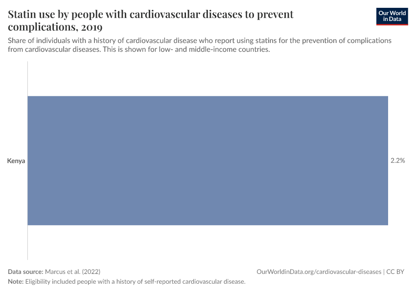 Marcus et al. (2022) – with minor processing by Our World in Data. “Statin use by people with cardiovascular diseases to prevent complications” [dataset]. Marcus et al., “Use of statins for the prevention of cardiovascular disease in 41 low-income and middle-income countries.” [original data]. Retrieved January 5, 2026 from https://archive.ourworldindata.org/20250909-093708/grapher/use-of-statins-for-secondary-prevention-amongst-eligibible-individuals.html (archived on September 9, 2025).