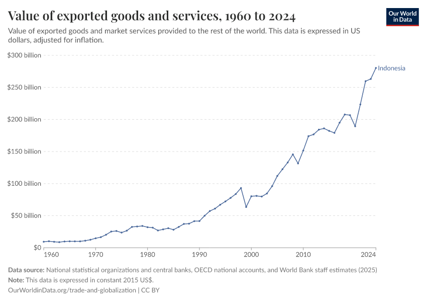 “Data Page: Value of exported goods and services”. Our World in Data (2026). Data adapted from National statistical organizations and central banks, OECD national accounts, and World Bank staff estimates. Retrieved from https://archive.ourworldindata.org/20260108-110049/grapher/value-of-exported-goods-and-services.html [online resource] (archived on January 8, 2026).How to cite this data