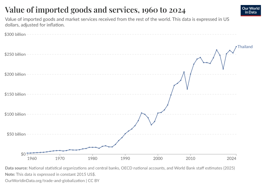 “Data Page: Value of imported goods and services”. Our World in Data (2026). Data adapted from National statistical organizations and central banks, OECD national accounts, and World Bank staff estimates. Retrieved from https://archive.ourworldindata.org/20260108-110049/grapher/value-of-imported-goods-and-services.html [online resource] (archived on January 8, 2026).How to cite this data