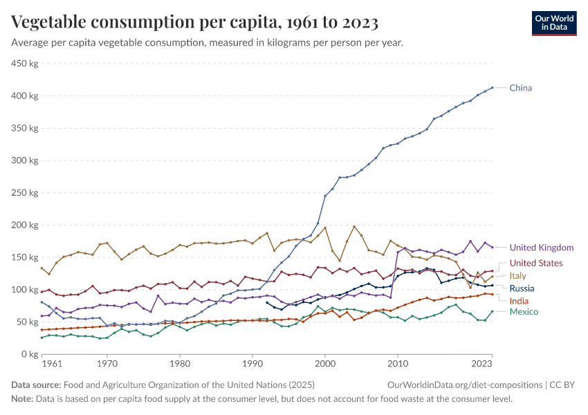“Data Page: Yearly per capita supply of vegetables”. Our World in Data (2026). Data adapted from Food and Agriculture Organization of the United Nations. Retrieved from https://archive.ourworldindata.org/20260417-161325/grapher/vegetable-consumption-per-capita.html [online resource] (archived on April 17, 2026).How to cite this data