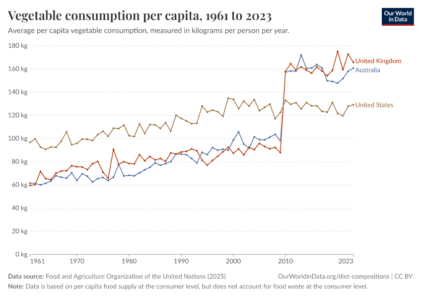 “Data Page: Yearly per capita supply of vegetables”. Our World in Data (2026). Data adapted from Food and Agriculture Organization of the United Nations. Retrieved from https://archive.ourworldindata.org/20260326-143922/grapher/vegetable-consumption-per-capita.html [online resource] (archived on March 26, 2026).How to cite this data
