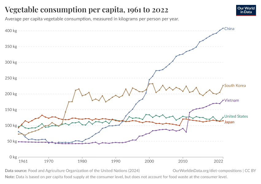 “Data Page: Yearly per capita supply of vegetables”. Our World in Data (2025). Data adapted from Food and Agriculture Organization of the United Nations. Retrieved from https://archive.ourworldindata.org/20251128-120039/grapher/vegetable-consumption-per-capita.html [online resource] (archived on November 28, 2025).How to cite this data