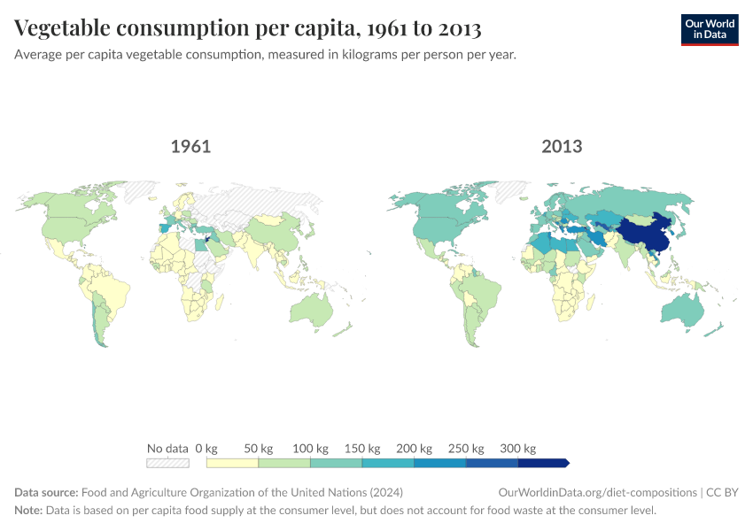 “Data Page: Yearly per capita supply of vegetables”. Our World in Data (2025). Data adapted from Food and Agriculture Organization of the United Nations. Retrieved from https://archive.ourworldindata.org/20251128-120039/grapher/vegetable-consumption-per-capita.html [online resource] (archived on November 28, 2025).How to cite this data