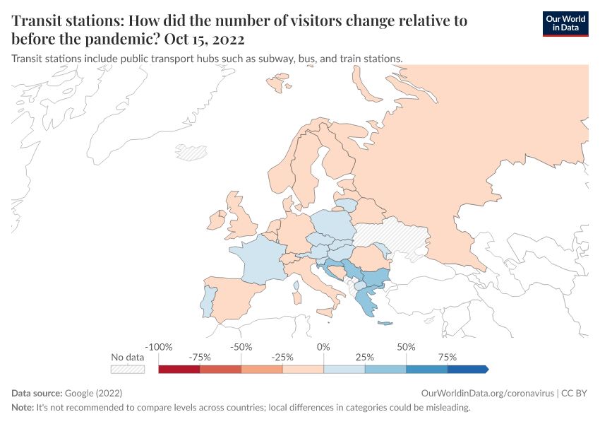 Google (2022) – with minor processing by Our World in Data. “Transit stations: How did the number of visitors change relative to before the pandemic?” [dataset]. Google, “COVID-19, Community Mobility Reports” [original data]. Retrieved January 15, 2026 from https://archive.ourworldindata.org/20250909-093708/grapher/visitors-transit-covid.html (archived on September 9, 2025).