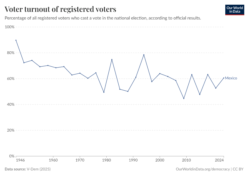 “Data Page: Voter turnout of registered voters”, part of the following publication: Bastian Herre, Lucas Rodés-Guirao, and Esteban Ortiz-Ospina (2013) - “Democracy”. Data adapted from V-Dem. Retrieved from https://archive.ourworldindata.org/20251209-133038/grapher/voter-turnout-of-registered-voters.html [online resource] (archived on December 9, 2025).How to cite this data