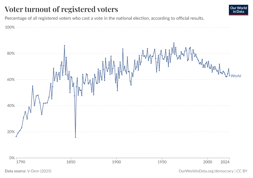 “Data Page: Voter turnout of registered voters”, part of the following publication: Bastian Herre, Lucas Rodés-Guirao, and Esteban Ortiz-Ospina (2013) - “Democracy”. Data adapted from V-Dem. Retrieved from https://archive.ourworldindata.org/20251209-133038/grapher/voter-turnout-of-registered-voters.html [online resource] (archived on December 9, 2025).How to cite this data