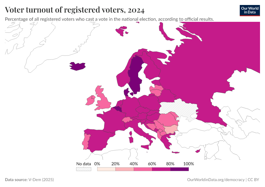 “Data Page: Voter turnout of registered voters”, part of the following publication: Bastian Herre, Lucas Rodés-Guirao, and Esteban Ortiz-Ospina (2013) - “Democracy”. Data adapted from V-Dem. Retrieved from https://archive.ourworldindata.org/20250925-233948/grapher/voter-turnout-of-registered-voters.html [online resource] (archived on September 25, 2025).How to cite this data
