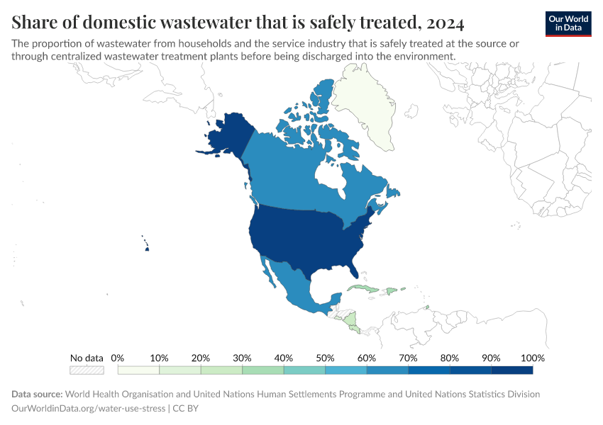 “Data Page: Share of domestic wastewater that is safely treated”. Our World in Data (2025). Data adapted from World Health Organisation and United Nations Human Settlements Programme and United Nations Statistics Division. Retrieved from https://archive.ourworldindata.org/20251125-165536/grapher/wastewater-safely-treated.html [online resource] (archived on November 25, 2025).How to cite this data