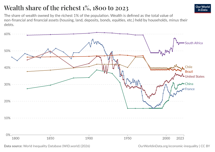 “Data Page: Wealth share of the richest 1%”, part of the following publication: Joe Hasell, Bertha Rohenkohl, Pablo Arriagada, Esteban Ortiz-Ospina, and Max Roser (2023) - “Economic Inequality”. Data adapted from World Inequality Database (WID.world). Retrieved from https://archive.ourworldindata.org/20260317-123427/grapher/wealth-share-richest-1-percent.html [online resource] (archived on March 17, 2026).How to cite this data