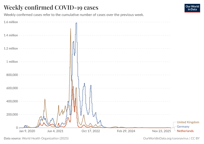 World Health Organization (2025) – processed by Our World in Data. “Weekly confirmed COVID-19 cases” [dataset]. World Health Organization, “COVID-19 Dashboard WHO COVID-19 Dashboard - Daily cases and deaths” [original data]. Retrieved December 12, 2025 from https://archive.ourworldindata.org/20251211-063340/grapher/weekly-covid-cases.html (archived on December 11, 2025).