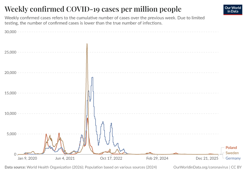 “Data Page: Weekly confirmed COVID-19 cases per million people”, part of the following publication: Edouard Mathieu, Hannah Ritchie, Lucas Rodés-Guirao, Cameron Appel, Daniel Gavrilov, Charlie Giattino, Joe Hasell, Bobbie Macdonald, Saloni Dattani, Diana Beltekian, Esteban Ortiz-Ospina, and Max Roser (2020) - “COVID-19 Pandemic”. Data adapted from World Health Organization, Various sources. Retrieved from https://archive.ourworldindata.org/20260111-063230/grapher/weekly-covid-cases-per-million-people.html [online resource] (archived on January 11, 2026).How to cite this data