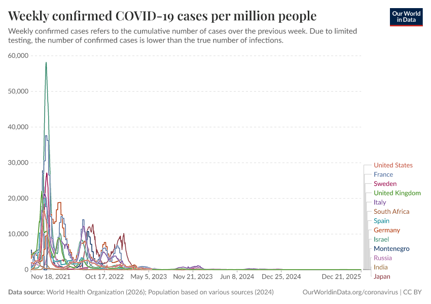 “Data Page: Weekly confirmed COVID-19 cases per million people”, part of the following publication: Edouard Mathieu, Hannah Ritchie, Lucas Rodés-Guirao, Cameron Appel, Daniel Gavrilov, Charlie Giattino, Joe Hasell, Bobbie Macdonald, Saloni Dattani, Diana Beltekian, Esteban Ortiz-Ospina, and Max Roser (2020) - “COVID-19 Pandemic”. Data adapted from World Health Organization, Various sources. Retrieved from https://archive.ourworldindata.org/20260111-063230/grapher/weekly-covid-cases-per-million-people.html [online resource] (archived on January 11, 2026).