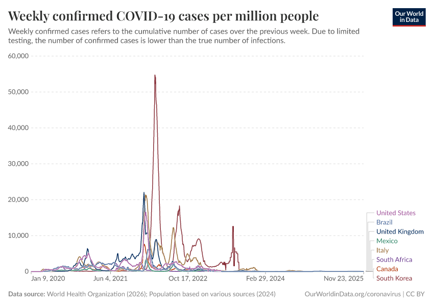 World Health Organization (2026); Population based on various sources (2024) – with major processing by Our World in Data. “Weekly confirmed COVID-19 cases per million people” [dataset]. World Health Organization, “COVID-19 Dashboard WHO COVID-19 Dashboard - Daily cases and deaths”; Various sources, “Population” [original data]. Retrieved January 1, 2026 from https://archive.ourworldindata.org/20260101-063338/grapher/weekly-covid-cases-per-million-people.html (archived on January 1, 2026).